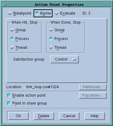 The When Hit, Stop radio buttons indicate what other threads TotalView stops when execution reaches the breakpoint, as follows: