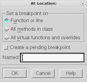 This dialog also allows the creation of a pending breakpoint. See Pending Breakpoints.