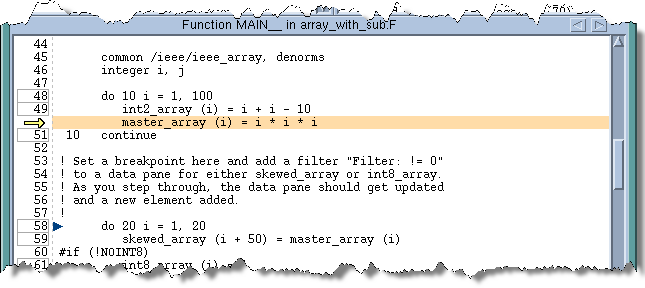 When you’re in replay mode, TotalView changes the highlight line from yellow to orange within the Source Pane.