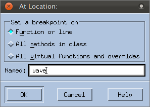 In a complex program, it may be easier to set a breakpoint using the At Location dialog, which allows you to specify where you want the breakpoint without having to first find the source line in the Source Pane. Using this dialog, you can set breakpoints on all methods of a class or all virtual functions, a useful tool for C++ programs.