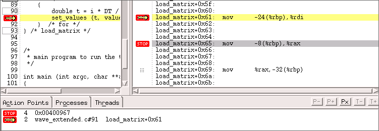 The Source Pane and Action Points tab display two breakpoints, one in source code and one in assembler code.