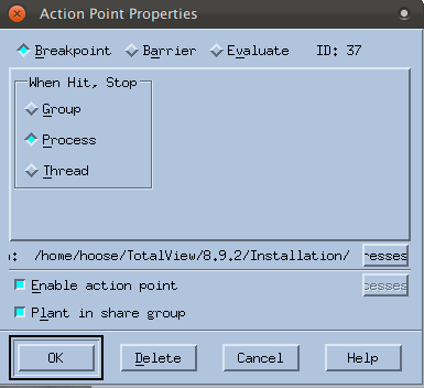 The Action Point Properties dialog box sets and controls an action point. Using this dialog, you can also change an action point’s type to breakpoint, barrier point, or eval point, and define the behavior of threads and processes when execution reaches this action point.