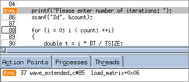 You can define an action point identified with a code fragment to be executed. This is called an eval point. This allows you to test potential fixes for your program, set the values of your program’s variables, or stop a process based on some condition. You can also send data to the Visualizer to produce an animated display of changes to your program’s data, discussed in Visualizing Arrays.
