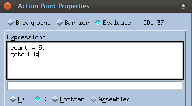 *Click OK to close the dialog. This code will be executed before the printf() statement, and then will jump to line 88 where the for loop begins. This sets the count to 5 and avoids having to enter user input. (Code entered here is specific to TotalView debugging only, and is not persisted to your actual source code.)