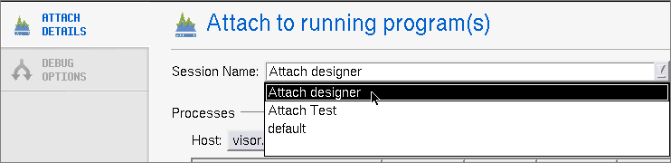 Similarly, the Attach to a running program dialog displays any previous attach sessions: