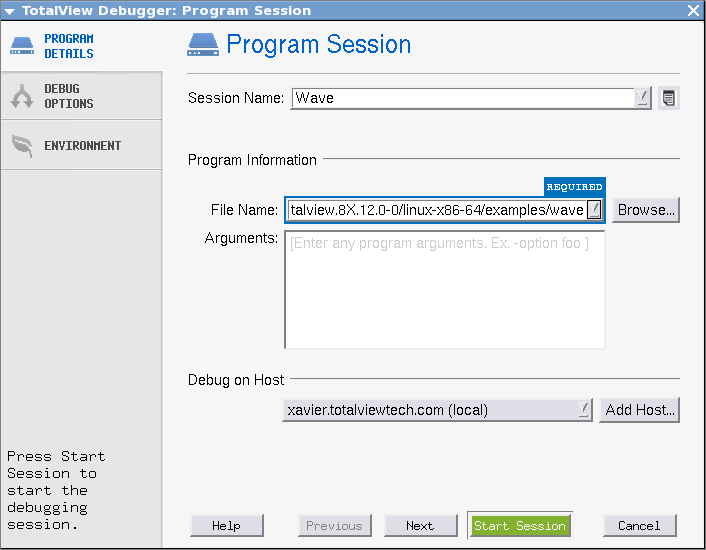 Starts TotalView without loading a program or core file. Instead, TotalView launches the Sessions Manager’s Start a Debugging Session dialog where you can choose the type of session you plan to debug.