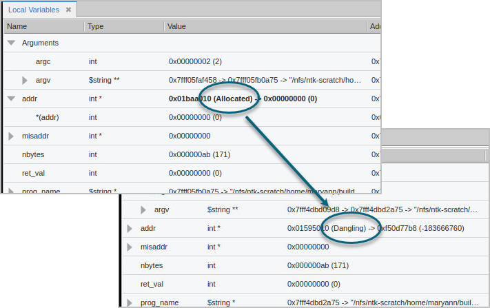 If you enable memory debugging, TotalView displays information in the Local Variables view about the variable’s memory status; that is, whether the memory is allocated or deallocated. The following small program allocates a memory block, sets a pointer to the start of the block, and then deallocates the block: