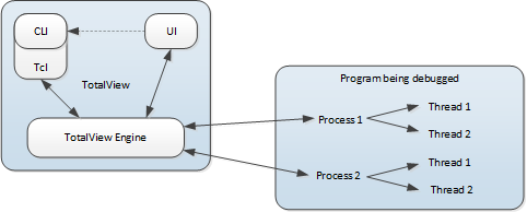 The CLI and the UI are components that communicate with the TotalView engine. The dotted arrow between the UI and the CLI in