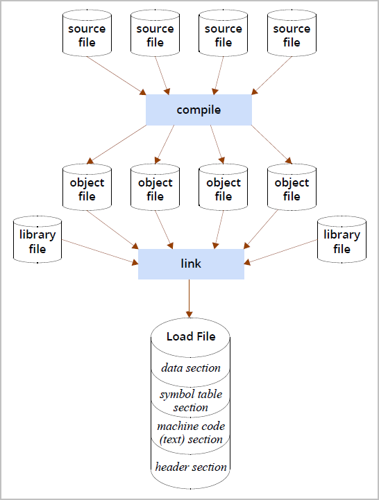 Compiling these files creates object files, which a linker merges, along with any external libraries, into a load file. This load file is the executable program stored on your computer’s file system.