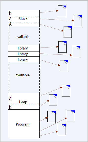 Similarly, the heap shows two allocations, each mapped to its own page. (This illustration vastly simplifies actual memory mapping, since a page can have many stack frames and many heap allocations.)