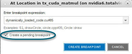 To immediately set a pending breakpoint, click Create a pending breakpoint directly in the At Location dialog. This is useful if you are sure that the function name you are entering is correct (even if TotalView can’t find it) because it will be dynamically loaded at runtime. The breakpoint is set as pending: