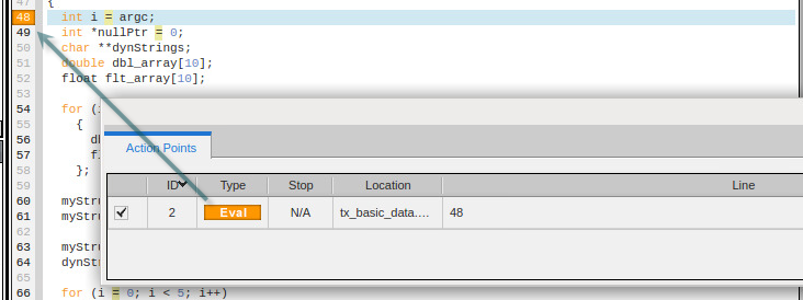 If TotalView successfully creates the evalpoint, the dialog closes, the Action Points view displays the evalpoint, and the Source view highlights the line number with the evalpoint in the corresponding color.