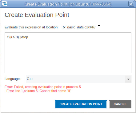 If TotalView cannot create the evalpoint, it displays an error message below the box.