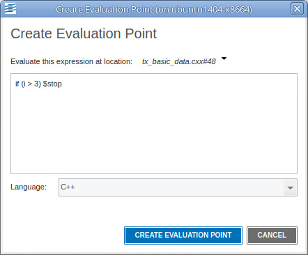 This launches the Create Evaluation Point dialog. Enter the code fragment and select the language (by default the language is chosen based on what TotalView detects as the language for the application). You can see the full path to the source file using the drop down arrow next to the file’s name.