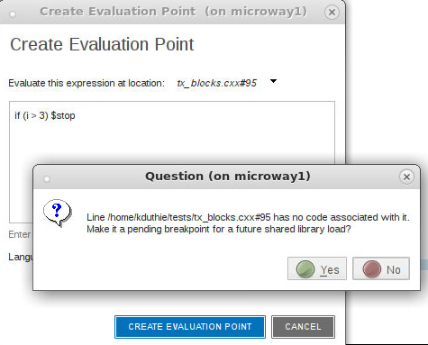 To create a pending evalpoint, simply create an evalpoint at the source line where you know dynamically loaded code will be. Once you click Create Evaluation Point in the Create Evaluation Point dialog and TotalView can’t locate any debug symbols for that line, a pop-up prompts you to choose to create a pending evalpoint: