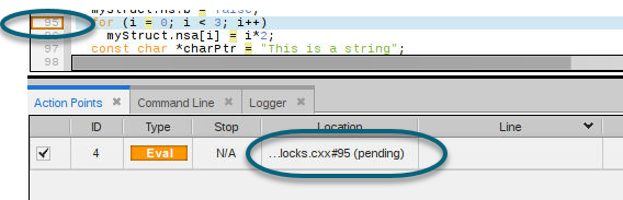 If you click Yes, the evalpoint is created, identified as pending with an orange boxed line in the Source view and a “pending” identifier in the Action Points tab: