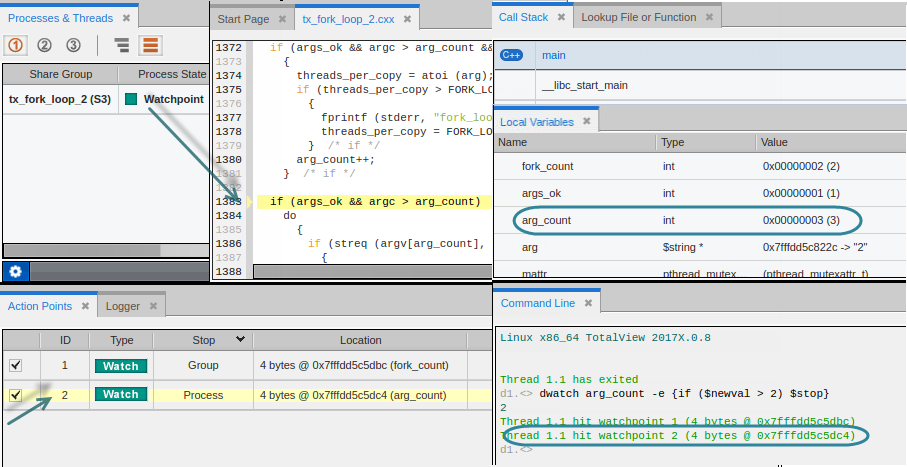 Action Point view displays a pale yellow background to identify the stopped watchpoint.