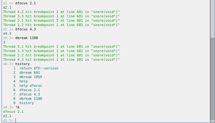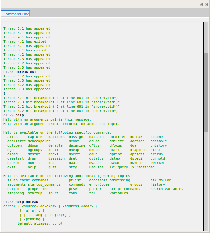 View the processes and threads state in the debugging session, as recorded by the debugger’s output to the CLI.