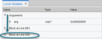 You can expand and collapse the list of variables in a block by clicking the left arrow next to it in the Local Variables pane: