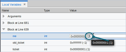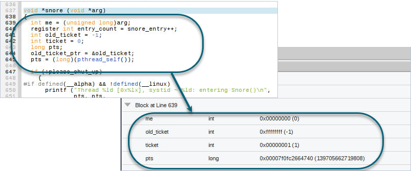 Value at the time that the thread stopped. (You can customize the visible columns in the view, turning on Thread ID and Address, similar to the Data View. See