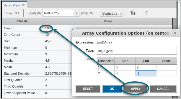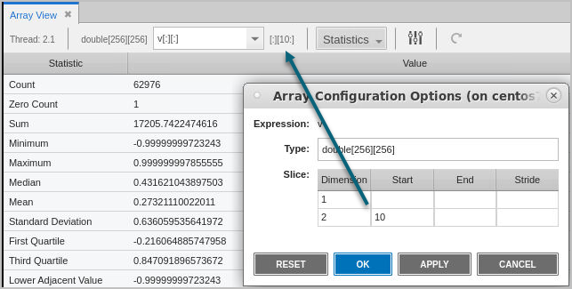 Slice the array to visualize or generate statistics on a sub-portion. To slice, open the Array Configuration Options dialog.