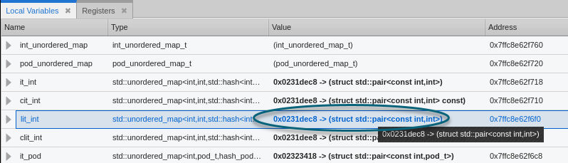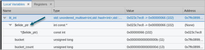 Note that the $elide_ptr member value is reported both in the top-level view and in a tooltip. There is no need to drill down into the structure’s contents because the value is already displayed.