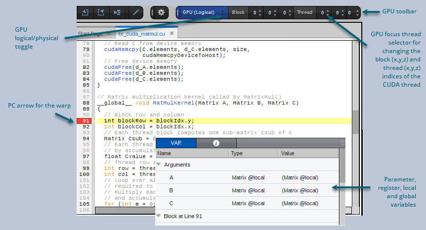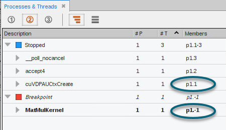 To view a CUDA host thread, select a thread with a positive thread ID in the Process and Threads view. To view a CUDA GPU thread, select a thread with a negative thread ID, then use the GPU thread selector on the logical toolbar to focus on a specific GPU thread. There is one GPU focus thread per CUDA thread, and changing the GPU focus thread affects all windows displaying information for a CUDA thread and all command line interface commands targeting a CUDA thread. In other words, changing the GPU focus thread can change data displayed for a CUDA thread and affect other commands, such as single-stepping.