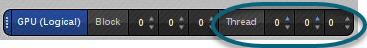 Any given thread has both a thread index in this 4D physical coordinate space, and a different thread index in the 6D logical coordinate space. These indices are shown in the two GPU toolbars.