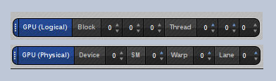 Two GPU toolbars display the two coordinate spaces. One is the logical coordinate space that is in CUDA terms grid and block indices: <<<(Bx,By,Bz),(Tx,Ty,Tz)>>>. The other is the physical coordinate space that is in hardware terms the device number, streaming multiprocessor (SM) number on the device, warp (WP) number on the SM, and lane (LN) number on the warp.