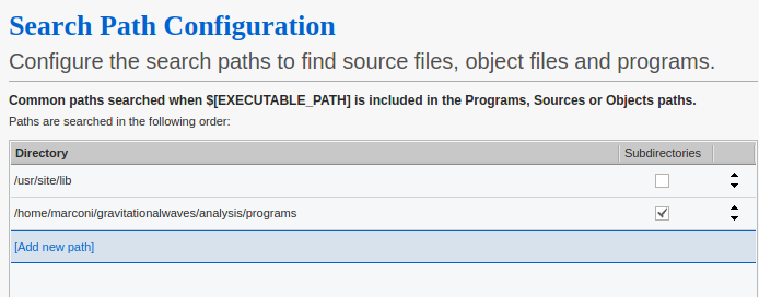 To add a path, click on Add new path and start typing. The interface accepts only one path per line. If you type in two or more paths separated by colons, they are divided into separate lines when you click Apply. Click the Subdirectories box to search recursively beginning at the specified directory as root. Use the up and down icons to adjust the search order.