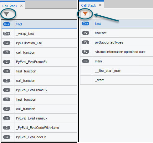 NOTE: If the Call Stack has not been transformed to display Python calls, click the transform button (