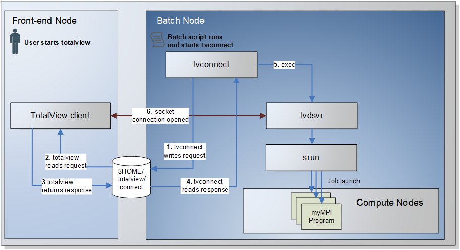 5. tvconnect execs tvdsvr, the command that allows TotalView to control and debug a program on a remote machine.