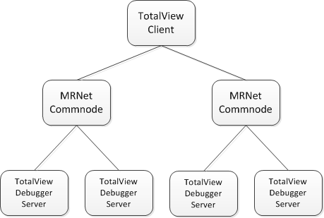 The second model uses MRNet to form a tree of debugger server and MRNet communication processes connected to the TotalView front-end client, which forms the root of the tree. MRNet supports building many different shapes of trees, but note that the shape of the tree (for example, depth and fan-out) can greatly affect the performance of the debugger. The following sections describe how to control the shape of the MRNet tree in TotalView.