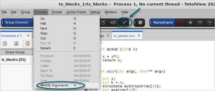 1. From within a debugging session, choose the Process menu, and then Modify Arguments. Alternatively, click the Modify Arguments () icon on the toolbar or press the shortcut key A.