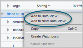 Use the Local Variables view to add variables to the Data View, either by using the context menu or by dragging and dropping. Choose Add to Data View to add to the existing view, or Add to New Data View to create a new Data View window.
