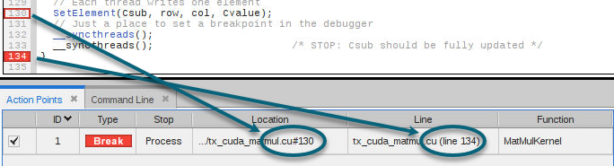 Using dactions to display pending and mixed breakpoint detail before and after CUDA code has loaded. |