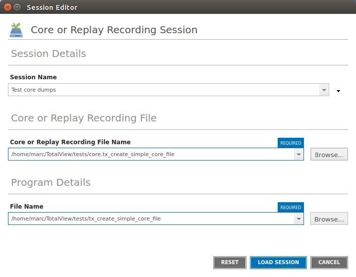 To configure a core file or Replay Recording debug session, select Load Core or Replay Recording File from the Start Page. The “Core or Replay Recording Session” dialog launches.