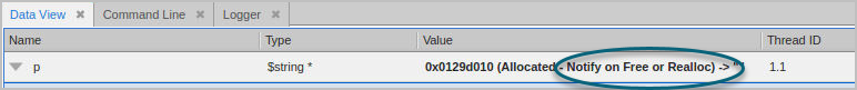 To tag a specific memory block, run to a location in your code and examine a pointer variable in either the Local Variable view or Data View. Dereference the pointer, then right click on it, and select Notify on Free or Realloc from the context menu.