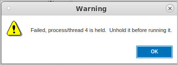 If you hold a process, then choose Process > Go, TotalView launches a warning popup that you first need to unhold the process before running it: