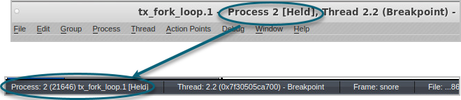 When TotalView is holding a process, the Processes & Threads view displays Stopped, and the title and status bar display “[Held”] for that process.