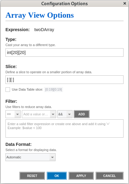 When you make changes in the Configuration Options dialog, you can click Apply to immediately view your changes in the Array View without closing the dialog. Click Reset to undo your changes. Click OK to apply your changes and close the dialog.