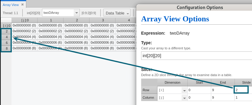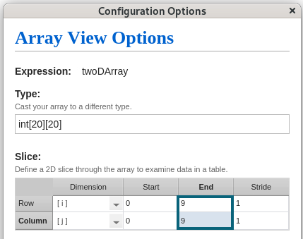 To add a stride of 2 to one of the dimensions in the previous slice example, enter the stride value in the Configuration Options dialog as follows, and then click Apply. The array stride is updated in the Data Table view.