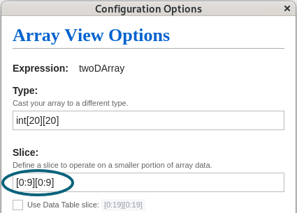 Figure 72 shows the Configuration Options dialog when opened from the Table Data view for a 3D array. Note the additional settings for Other Slice Dimensions.