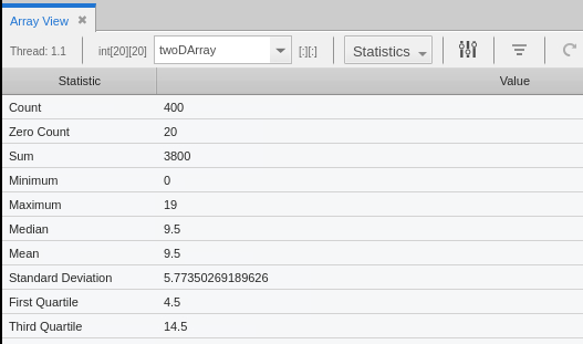 In this default representation of the array, each dimension (i and j) shows all elements 0 through 19 (that is, a slice of [0:19][0:19]).