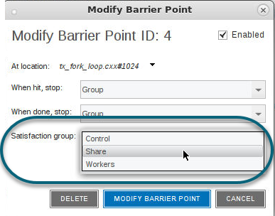 Control and Share settings hold at the process level. For multithreaded programs, to hold the threads at the barrier point, use the Workers setting, which holds at the thread level.