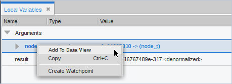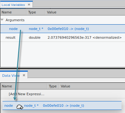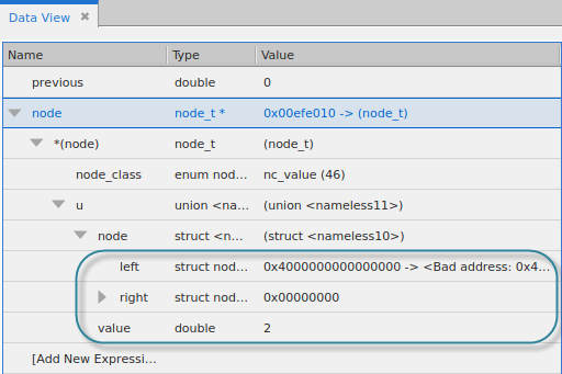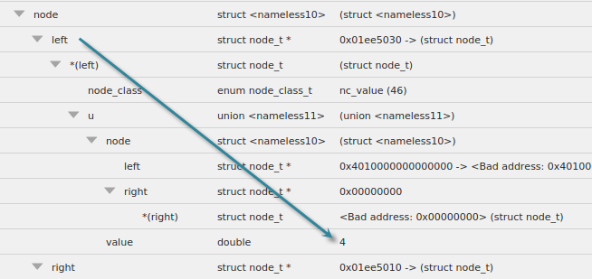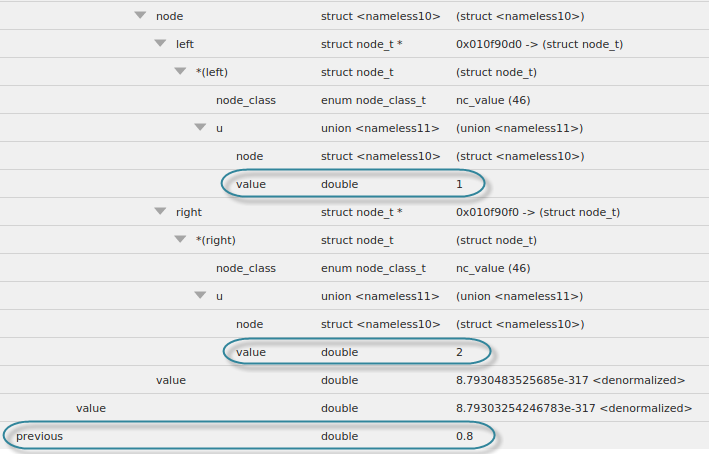 To view any nested structure, click the right-arrow, which means that additional nested structures exist. Here, we’ve drilled into the node variable’s union u to see that it contains a left and right struct, and a double value.
