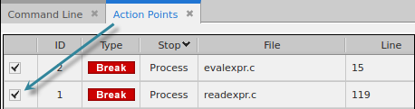 Re-enable the breakpoint at line 119 in the readexpr() function by clicking on its checkbox in the Action Points view, or recreate it if necessary: