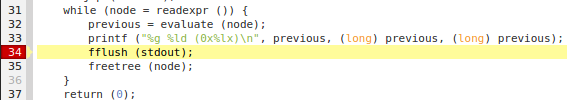 As each expression is evaluated and printed to stdout, when the stdout buffer is flushed, the Input/Output view shows the result of evaluating the expression. Run the program to the end to see the completed output.
