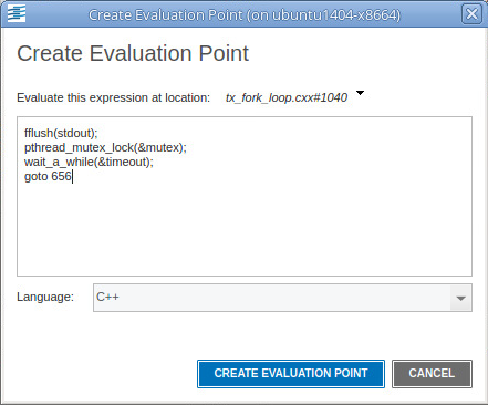 For example, suppose you need to change several statements. Just add these to an action point, then add a goto (C) or GOTO (Fortran) statement that jumps over the code you no longer want executed. For example, the evalpoint in Figure 26 executes three statements and then skips to line 656.