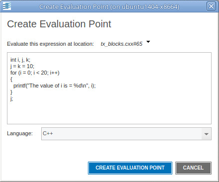 Notice the last statement in the Create Evaluation Point dialog on the left in Figure 27. The results are printed in the shell in which TotalView is running, displayed on the right.